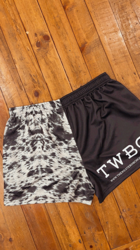 3RD PRE ORDER TWBC Black Cow Print Footy Shorts